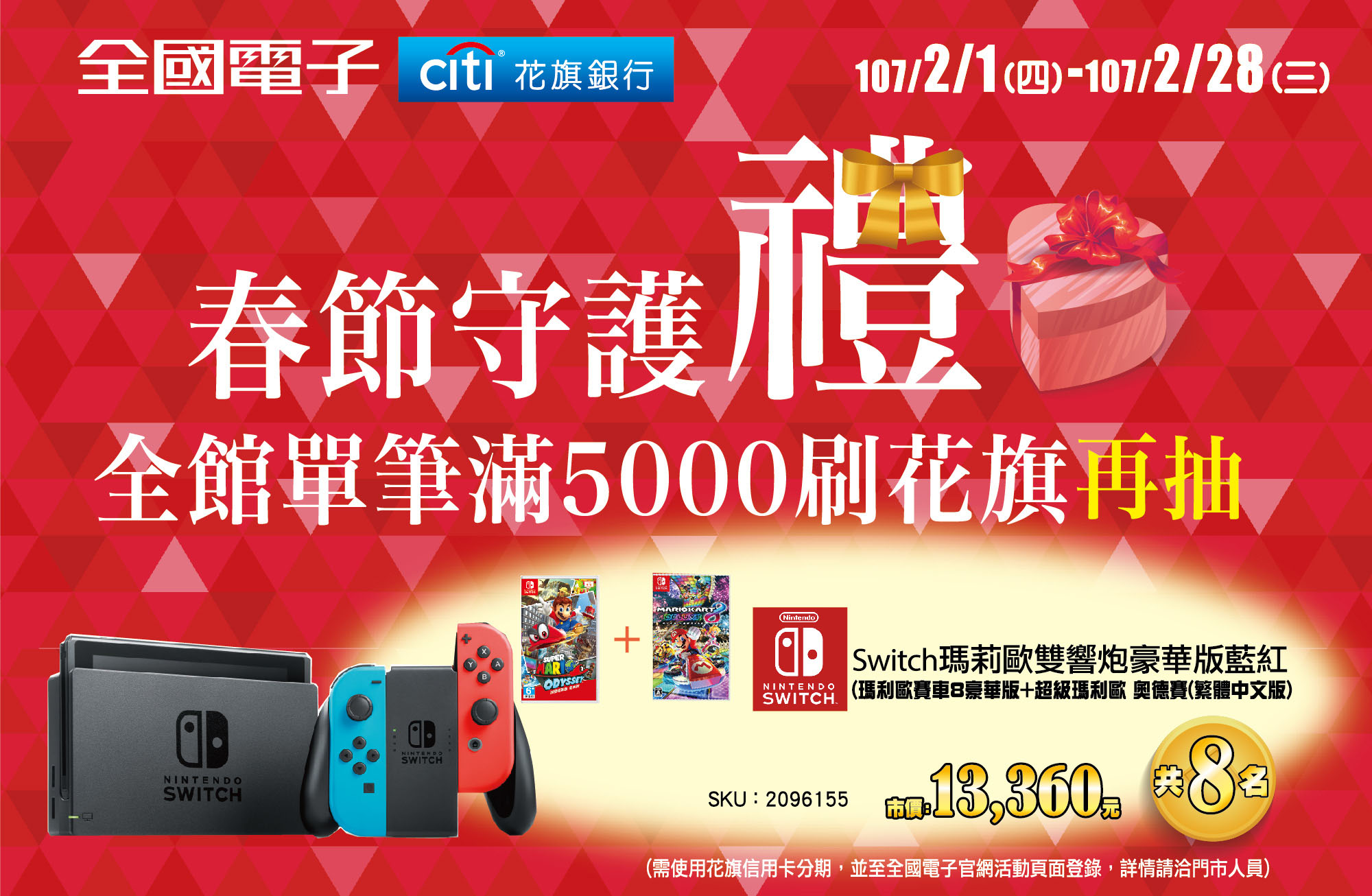 - 本公司將於107/3/9下午5:00前以電腦隨機方式抽出8名Switch瑪莉歐雙響炮豪華版藍紅之中獎人,並於全國電子官網公佈中獎名單。107/3/12前以電話與電子郵件通知中獎,中獎人須於107/3/19前(以郵戳為憑)將身份證正反面影本與發票正本郵寄至全國電子「花旗春節守護禮活動小組」(24891新北市五股區五工六路55號,以掛號郵件日期為主)完成兌獎手續,經本活動小組審核資料無誤後,107/3/23前寄出兌獎通知單,107/3/30憑兌獎通知單至指定門市領獎。