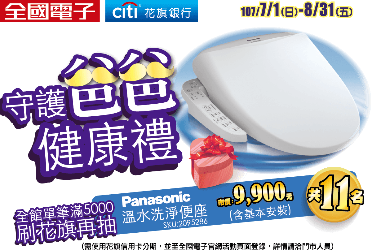 - 107/7/1-8/31於全國電子刷花旗信用卡購買全館商品單筆滿5000元並分期,至全國電子官網登錄有效發票號碼,即可參加「守護爸爸健康禮」抽獎活動,單筆消費發票金額每滿1,000元可獲1次抽獎機會(例如:單筆消費發票金額10,000元,系統將自動登錄10次抽獎機會),但每位會員僅可中獎一次,單筆交易若有多張發票,則以其中一張發票登錄即可。