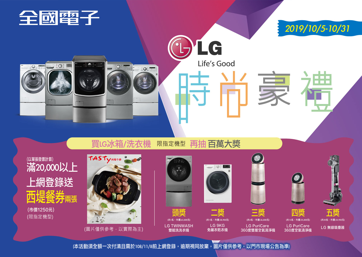 - 2. 108/10/5-10/31於全國電子購買指定機型LG冰箱、洗衣機滿20,000元並上全國電子官網登錄有效發票號碼,即送西堤餐券兩張,購買LG冰箱、洗衣機並上全國電子官網登錄有效發票號碼即可參加「LG 時尚豪禮」抽獎活動,單筆消費發票金額每滿1,000元可登錄1次(例如:單筆消費發票金額10,000元,系統將自動登錄10次抽獎機會),但每位會員僅可中獎一次,單筆交易若有多張發票,則以其中一張發票登錄即可。