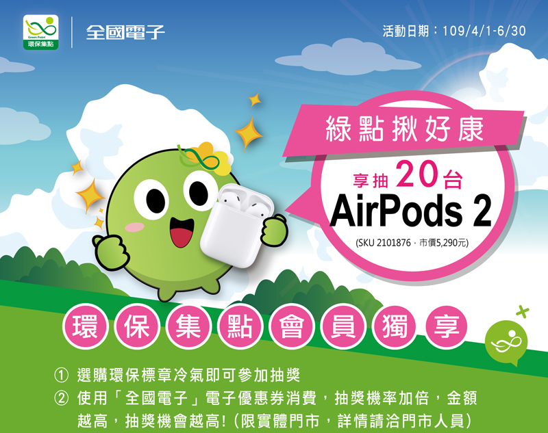 - 2. 109/4/1-6/30選購環保標章冷氣或兌換「全國電子」電子優惠券消費各環保綠點商品,即可參加「綠點揪好康」抽獎活動:①消費環保標章冷氣商品,每滿1,000元可獲1次抽獎機會(例如:單台環保標章冷氣交易金額10,000元,系統將自動登錄10次抽獎機會); ②兌換「全國電子」電子優惠券消費之綠點商品(每100點抵1元),每滿﹝500元(50000綠點)可獲1次抽獎機會、1,000元可獲2次抽獎機會…以此類推﹞。每位全國電子或環保集點會員僅可中獎一次。